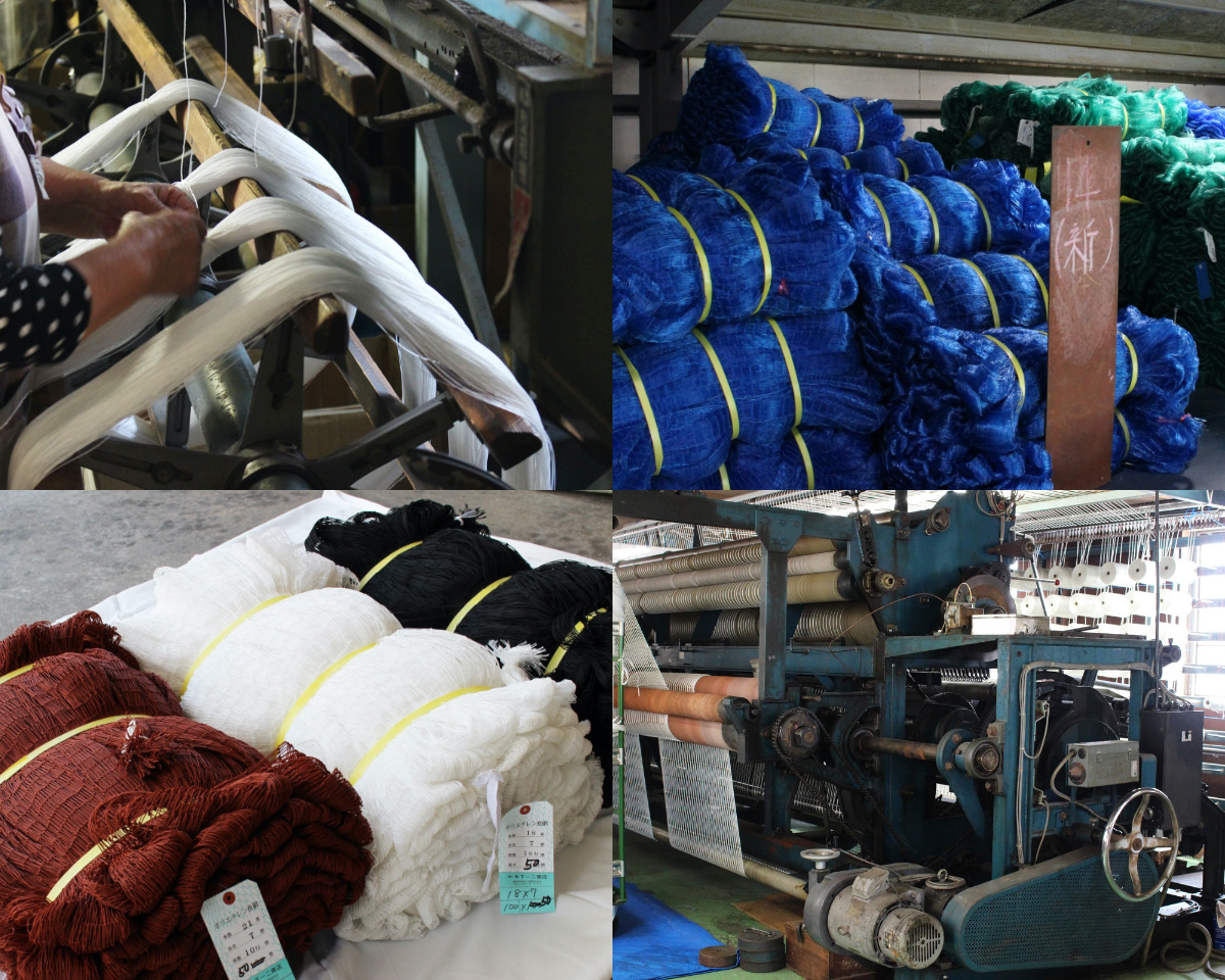 撚糸から編網、セット、加工を自社で一貫して行っており、国産の高品質の網を提供いたします。有結節(蛙又)のポリエチレン、ポリエステル、ナイロンマルチ、ナイロンモノ、強力繊維など様々な網を製造できます。